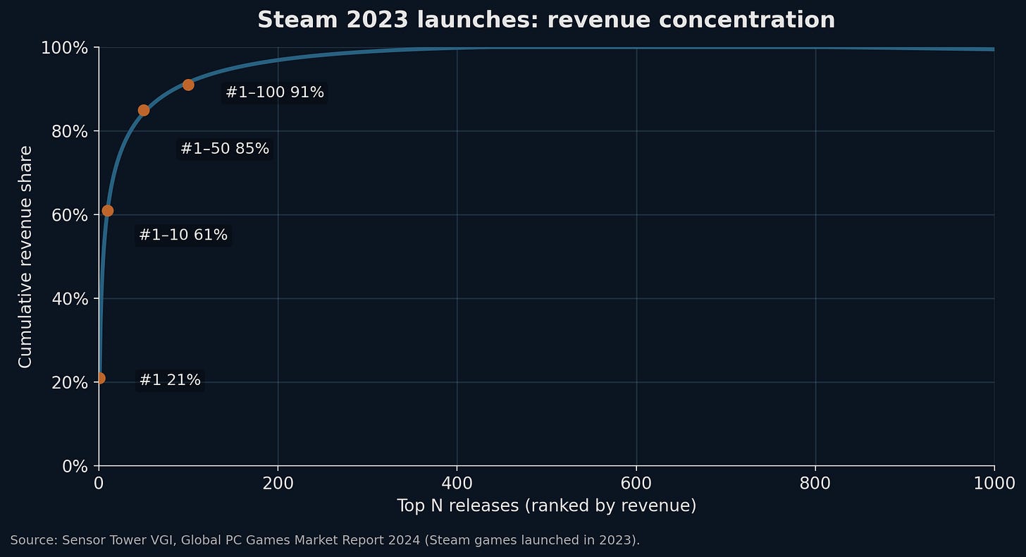 Just look at the thousands of annual game releases now fighting for 12% of playtime. The top game gets 20% of sales and top 1-10 take 60% of sales. From a profitability perspective, VCs have taken their allocations elsewhere, studios have shut down, and game-maker stocks have underperformed.