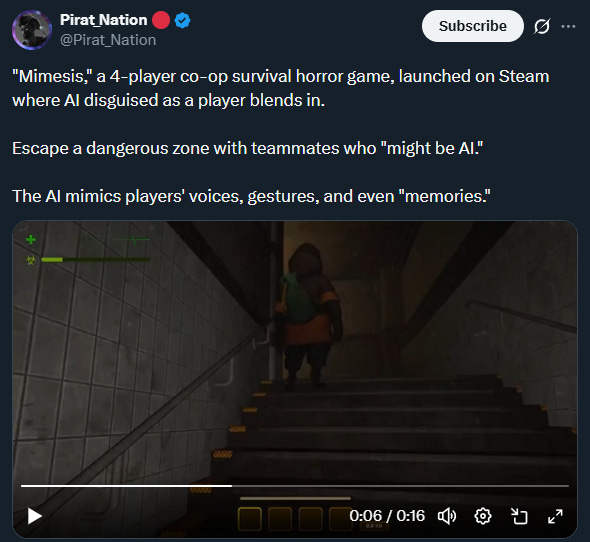 And AI enables incredible experiences - look at MIMESIS, a co-op survival horror where AI mimics teammates’ voices and actions to create paranoia.